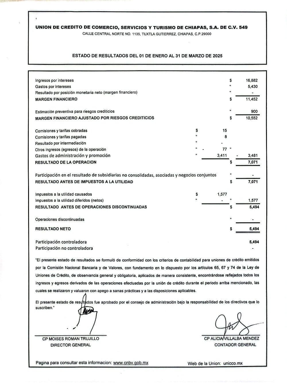 ESTADOS DE RESULTADOS CORRESPONDIENTES DEL 01 DE ENERO AL 31 DE MARZO DEL 2025 Consultar los estados financieros en la pagina www.CNBV.gob.mx