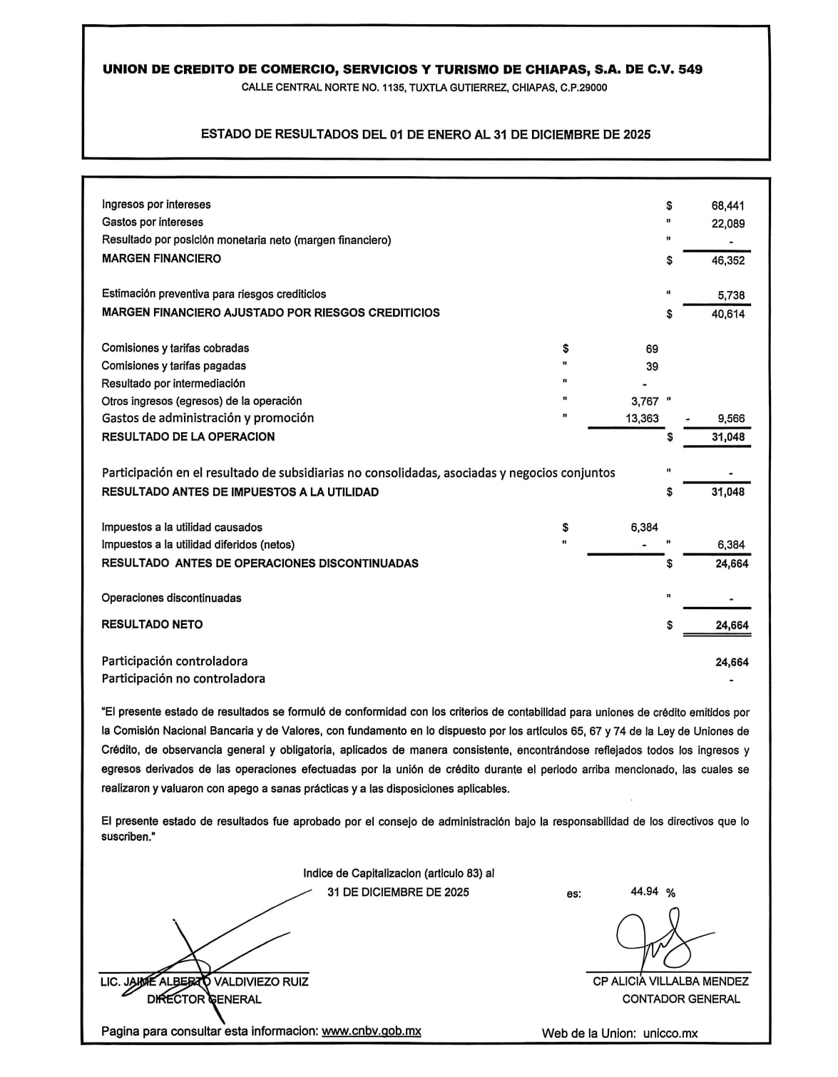 ESTADOS DE RESULTADOS CORRESPONDIENTES DEL 01 DE ENERO AL 31 DE DICIEMBRE DEL 2025 Consultar los estados financieros en la pagina www.CNBV.gob.mx
